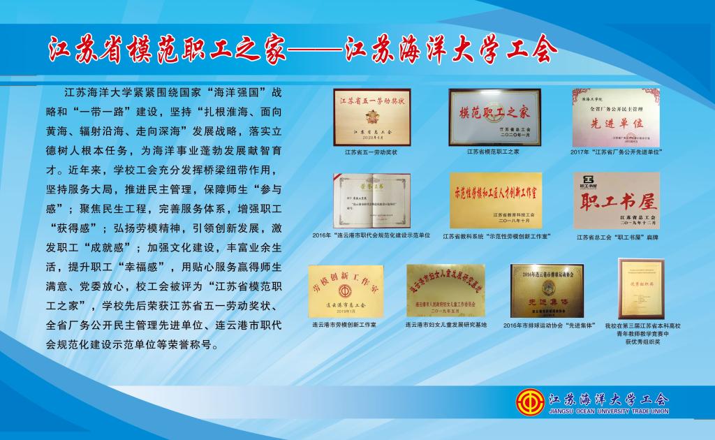在学校党委和上级工会组织的领导下,工会紧紧围绕学校党政中心工作,全面履行工会各项工作职能,全心全意为教职工服务,充分发挥桥梁纽带作用,较好地完成了各项工作任务。我校曾获评全国民主管理先进单位、“江苏省五一劳动奖状”“江苏省模范职工之家”“江苏省厂务公开民主管理先进单位”“连云港市职代会规范化建设示范单位”“连云港市教育工会工作绩效考核优秀单位”等。