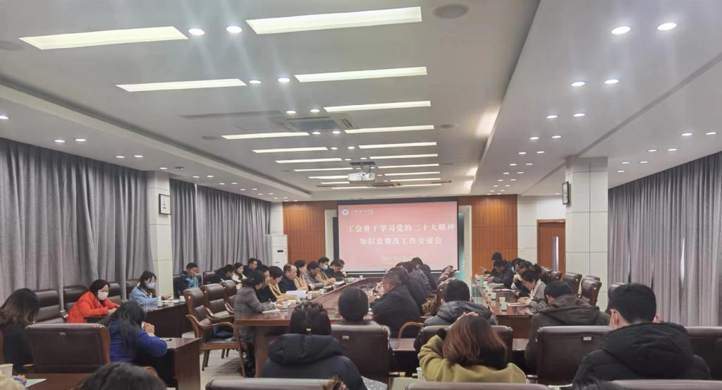 为深入学习贯彻党的二十大精神,激发工会骨干学习热情,3月17日上午,校工会在文渊楼会议室举行学习党的二十大精神知识竞赛及工会工作交流会。会议由校工会主席万洁主持,各分工会主席、委员参加了会议。
