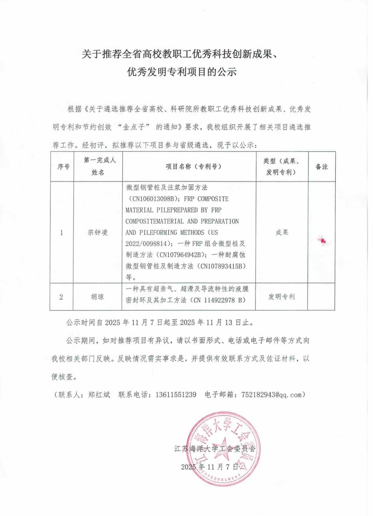 关于推荐全省高校教职工优秀科技创新成果、 优秀发明专利项目的公示