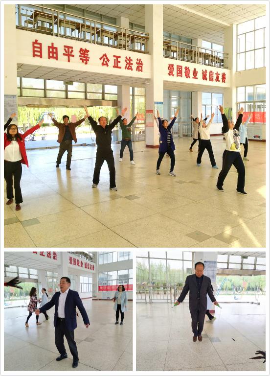 十点,测绘楼一楼大厅热闹非凡,跳绳、踢毽子、做广播体操。瞧!那一根根飞舞的绳子在双脚下起落,看!那一颗颗五彩的毽子在空中划出的优美弧线,纵使广播操的动作尚不规范,也难挡教师们的运动热情。