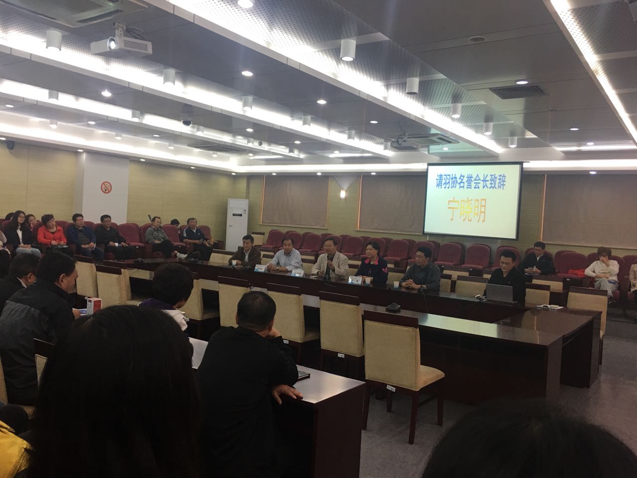 2016年10月21日下午,在校本部会议中心东海厅,新一届淮海工学院教职工羽毛球运动协会(以下简称“羽协”)举行了隆重的换届典礼,名誉会长宁晓明、工会主席万洁、羽协会长杨凤和分别作了讲话,秘书长王勇作工作报告。换届典礼举行得简单而隆重、严肃又活泼,典礼结束后组织了全体会员羽毛球健身活动。