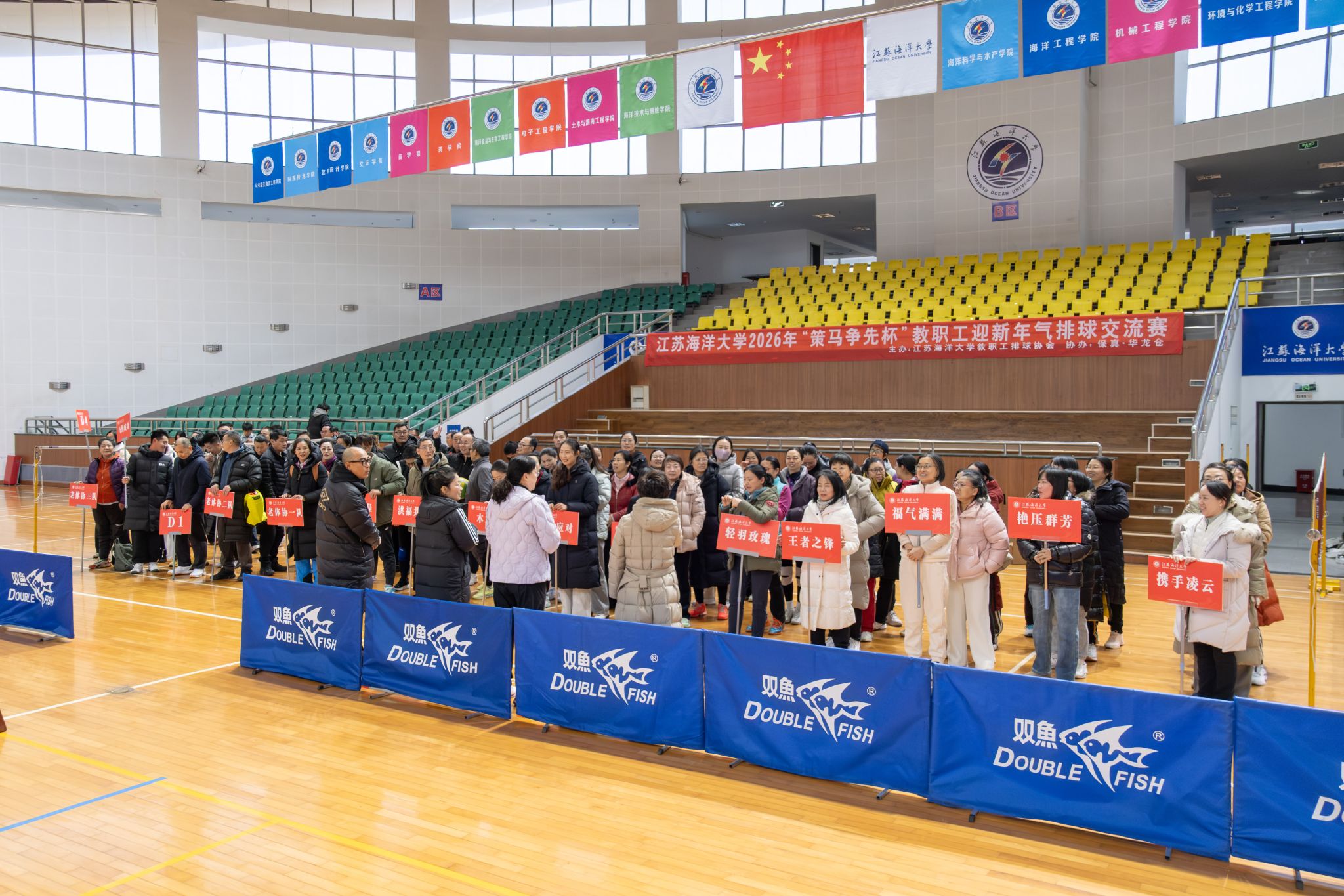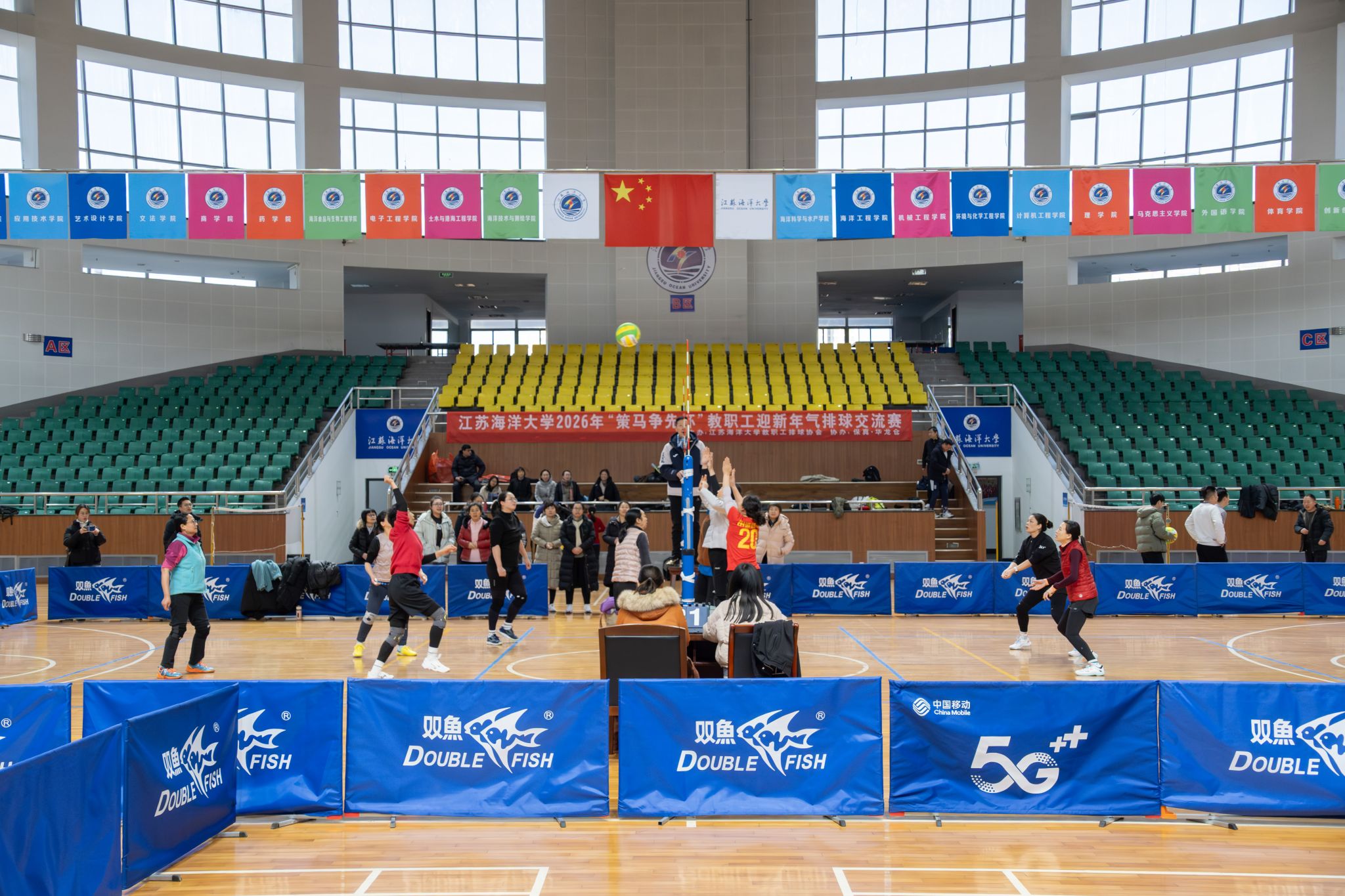 1月2日至3日,我校教职工排球协会在学校体育馆举办2026年“策马争先杯”教职工迎新年气排球交流赛。本次比赛共有全校11支教职工队伍及连云港市老体协等5支校外队伍参与,参赛人员近百人。校工会主席王晶、连云港市老体协气排球专委会主任万洁、校教职工排球协会会长韩传来出席开幕式,开幕式由校教职工排球协会副会长李海南主持。