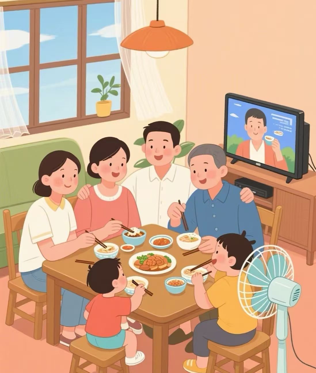 家里的饭桌上是妈妈亲手做的拿手好菜,爸爸讲述着年轻时的故事,孩子们笑声清脆。