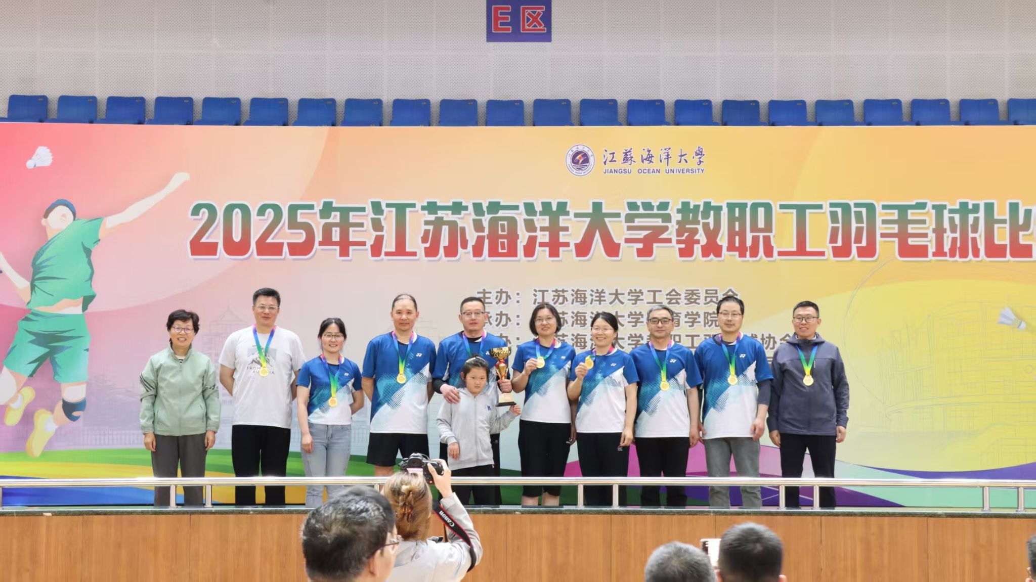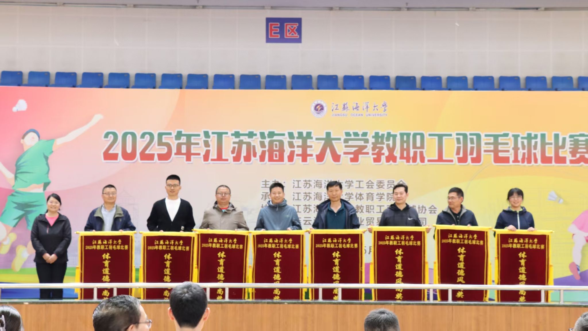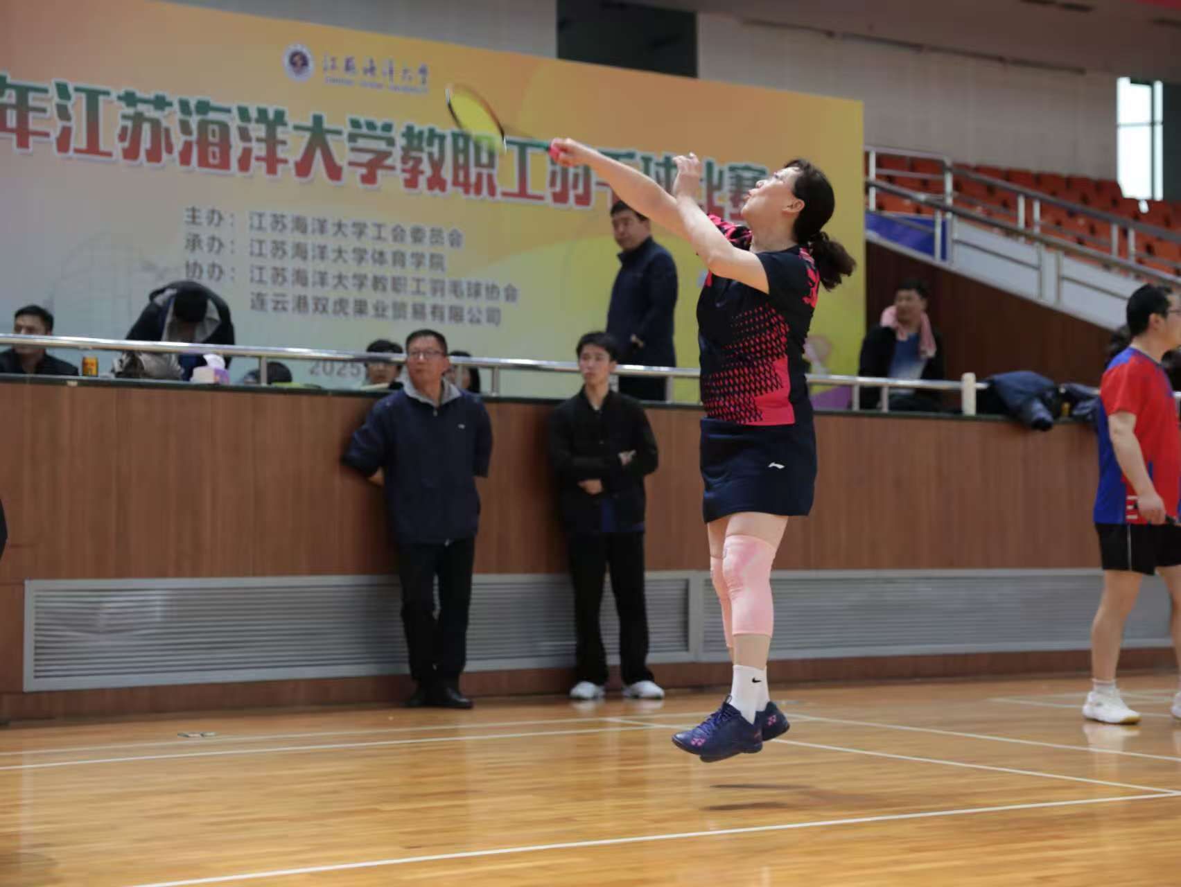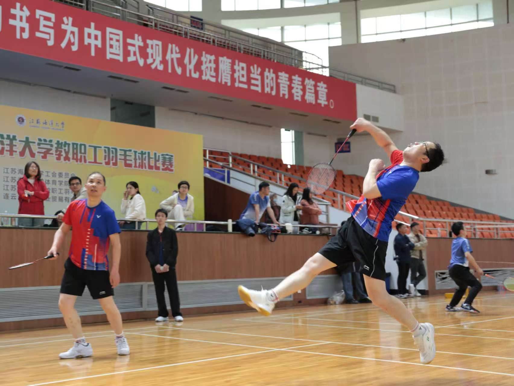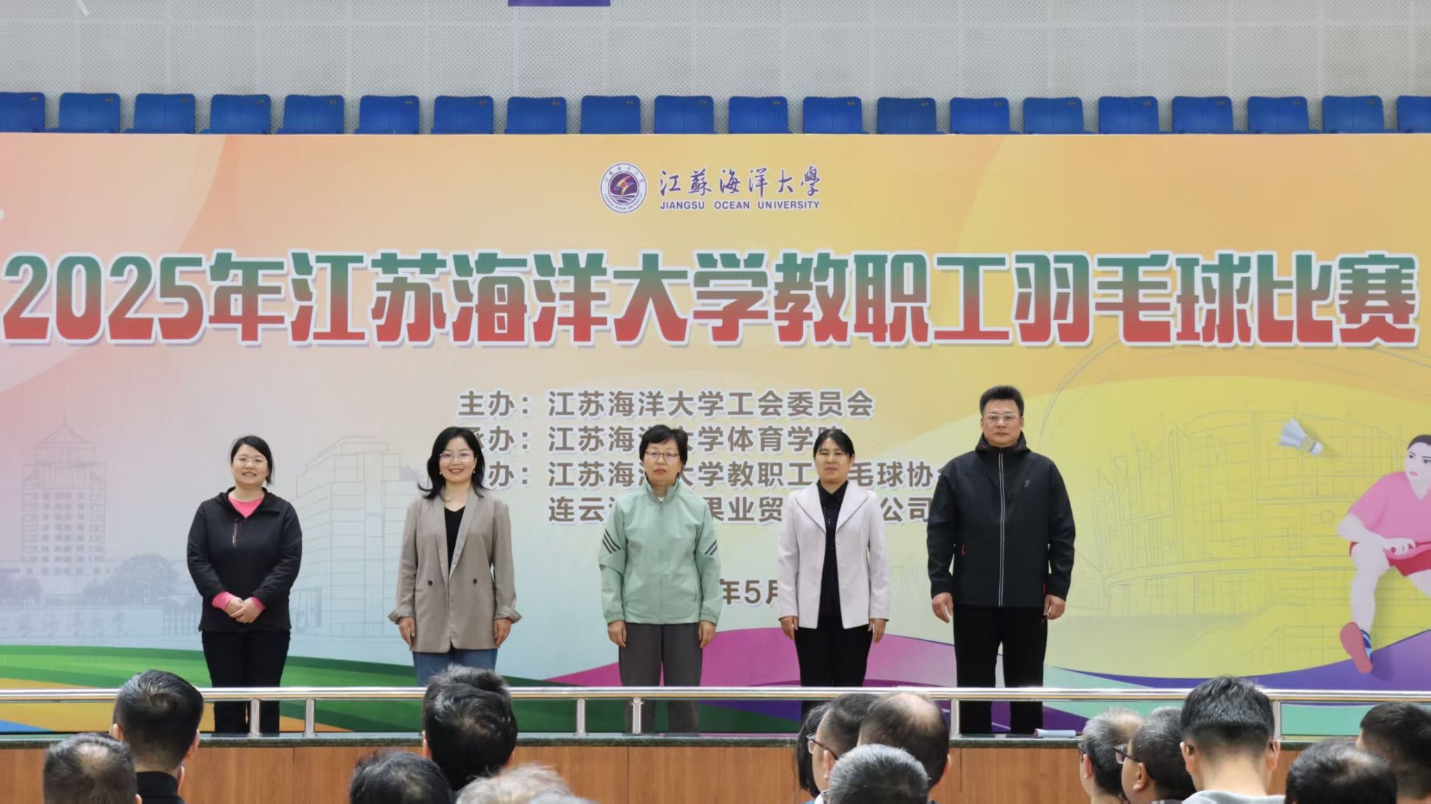 五月的校园,花团锦簇,生机盎然。5月10日,备受期待的2025年教职工羽毛球比赛在苍梧校区体育馆正式拉开帷幕。激昂的中华人民共和国国歌声响起,全场肃立齐唱,为赛事奠定了庄重而热烈的基调。本次比赛由校工会主办,体育学院承办,教职工羽毛球协会与连云港双虎果业贸易有限公司协办,全校20支队伍、200余名教职工踊跃参赛。
