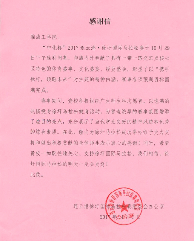 近日,连云港徐圩国际马拉松赛组委会向我校发来感谢信,就我校广大师生和志愿者为“中化杯”2017连云港·徐圩国际马拉松赛成功举办给予的支持和做出的贡献表达谢意。