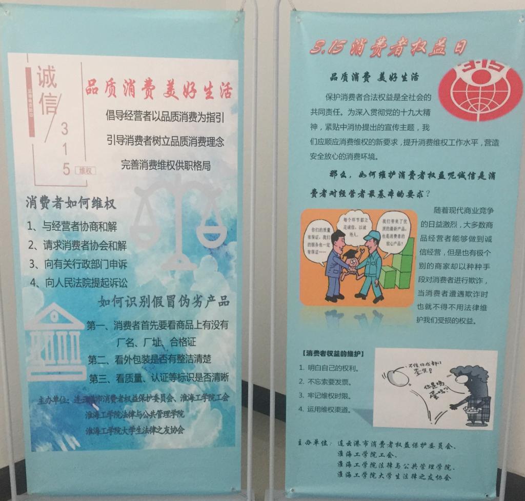 3月15日上午,由连云港市消费者权益保护委员会主办的以"品质消费,美好生活"为主题的3.15国际消费者权益日宣传纪念活动在海州区世纪缘大酒店北侧市民广场顺利举办。淮海工学院工会、法律与公共管理学院以及大学生法律之友协会代表我校作为委员单位参加此次活动。淮海工学院工会主席万洁、法管学院党总支副书记副院长黄金虎、辅导员赵亚婷以及法学专业学生代表出席本次活动。
