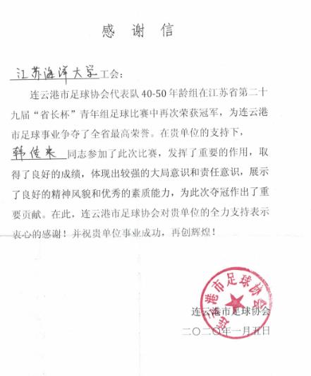 近日,连云港市足球协会给我校工会寄来感谢信,感谢我校工会对其工作的支持,充分肯定我校体育学院教师韩传来所取得的成绩和优秀素质。