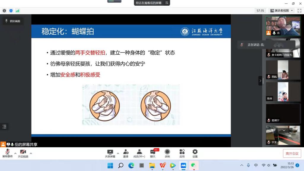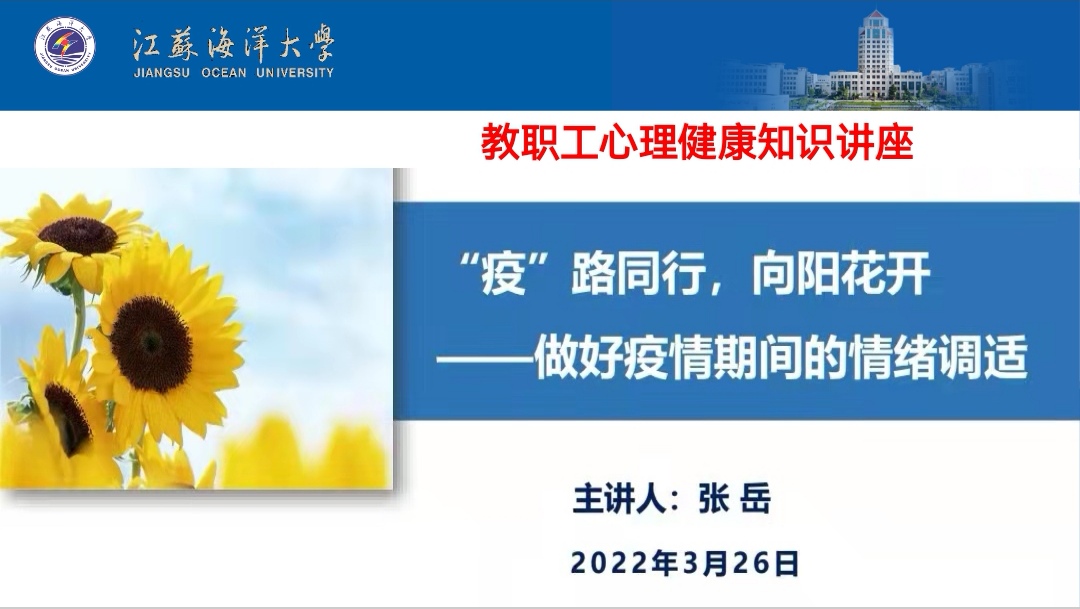 阳春三月,本是繁花次第开,新燕梁间舞,然而,月初突发的疫情打乱了港城人的正常生活。当前,我市疫情防控正处于关键时期,为做好广大教职工疫情期间的心理调适,积极开展疫情防控工作,3月26日下午,校工会举办了教职工心理健康知识讲座,我校及连云港市教育工会直属单位的部分教职工通过腾讯会议形式在线聆听了讲座。