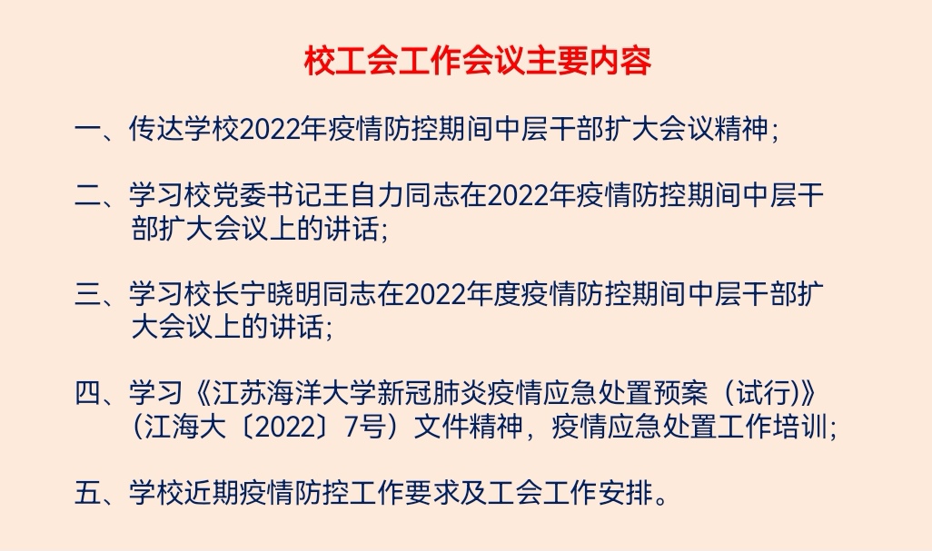 万洁组织工会人员认真学习了校党委书记王自力和校长宁晓明同志在学校2022年疫情防控期间中层干部扩大会议上的讲话和报告精神,坚决贯彻习近平总书记关于疫情防控工作的重要指示精神和省市、校疫情防控决策部署。学习《江苏海洋大学新冠肺炎疫情应急处置预案(试行)》(江海大〔2022〕7号)文件精神,充分认识学校制定应急预案的目的、意义和工作要求,全面了解方案内容和工作流程,明确工会的职责和任务,要学以致用,努力提升疫情应急处置能力。