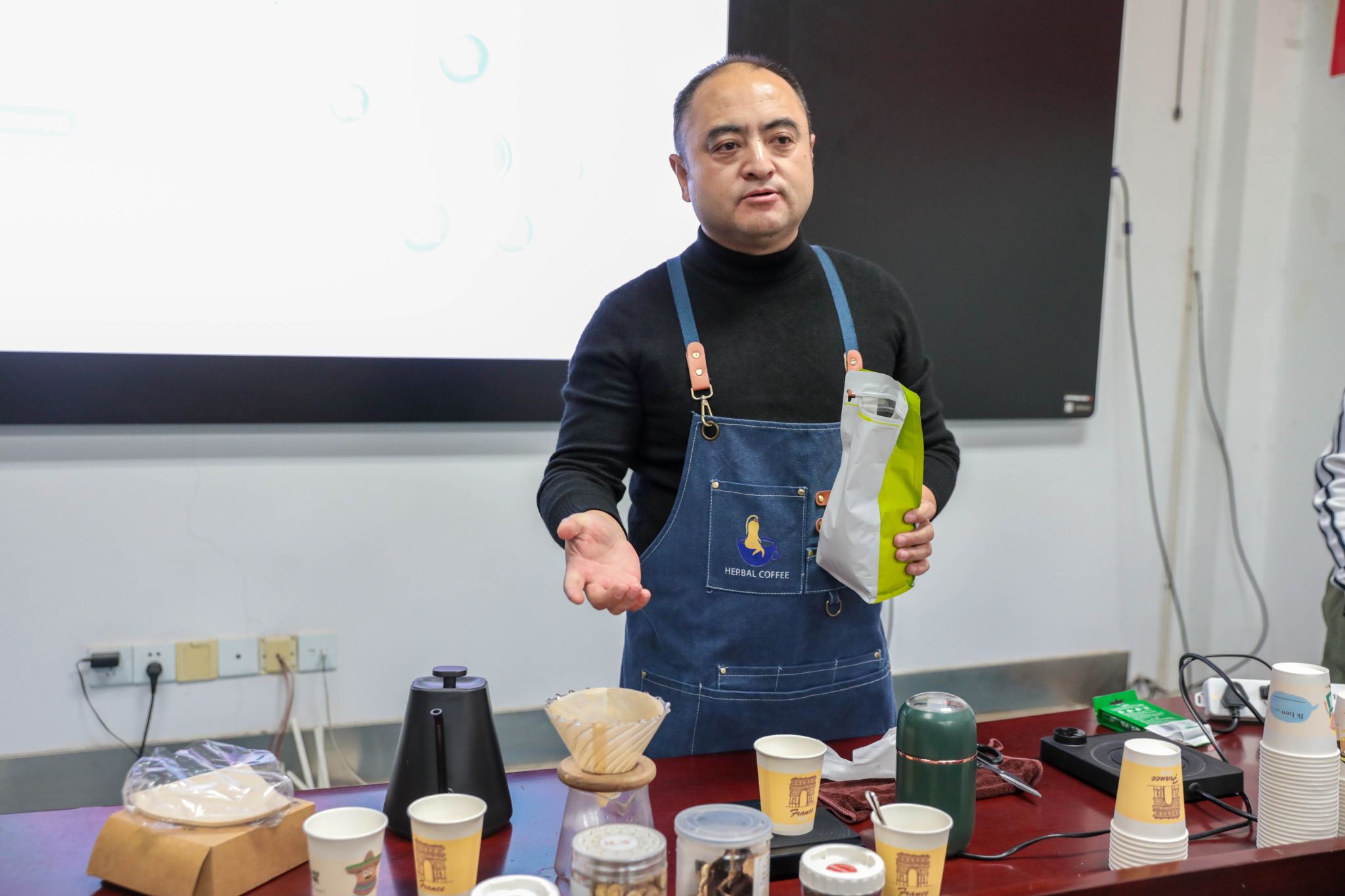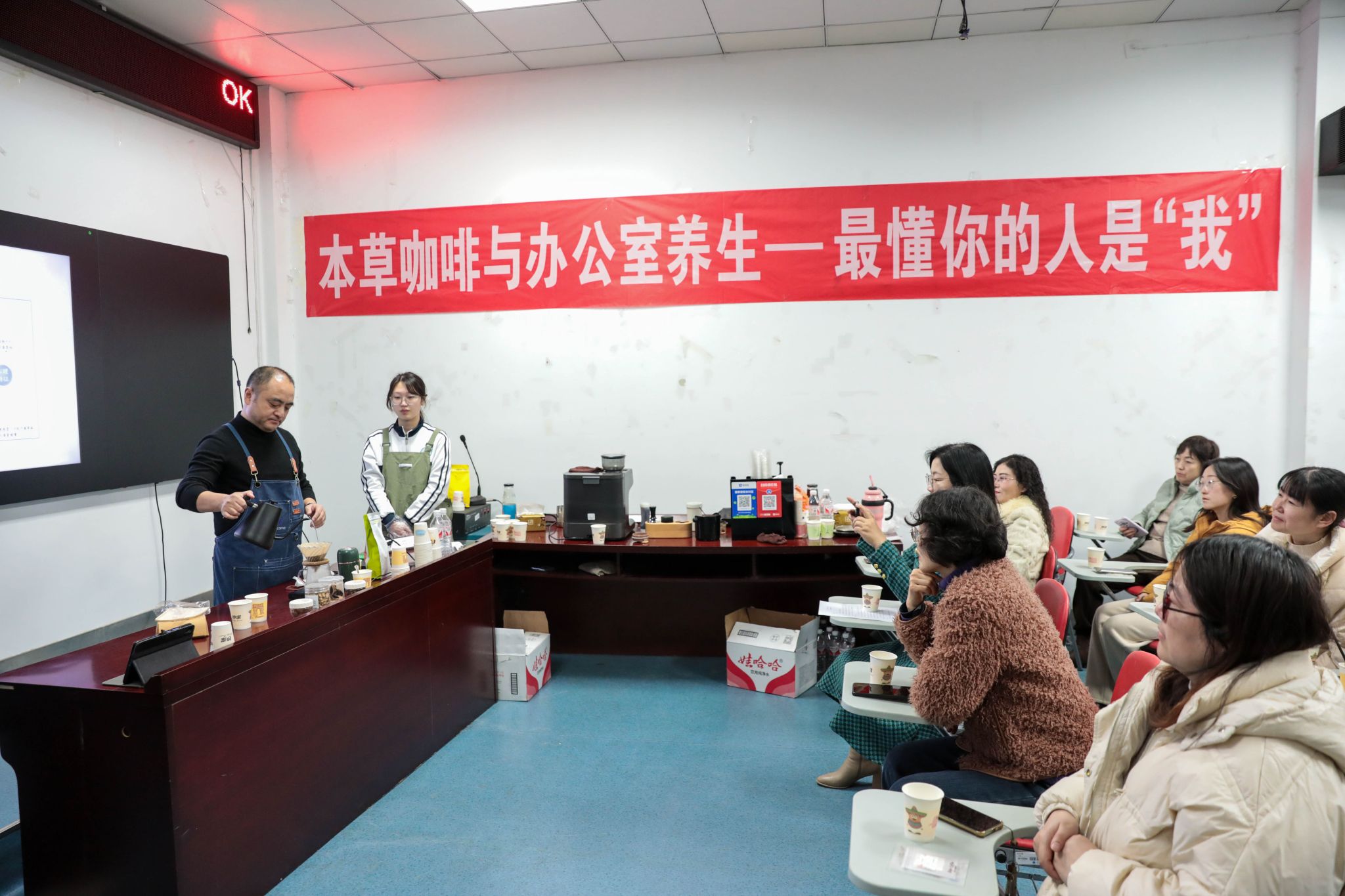活动现场,浓郁的咖啡香气与清新的本草气息相互交融。胡教授以咖啡为媒,传国粹之美,向教职工们详细介绍了本草咖啡的历史渊源、制作工艺、口感特点及所选药材的养生功效,还深入浅出地讲解了中医养生知识,引导教职工将养生理念融入日常工作生活。在本草咖啡制作体验区,教职工们亲手制作了属于自己的本草咖啡。