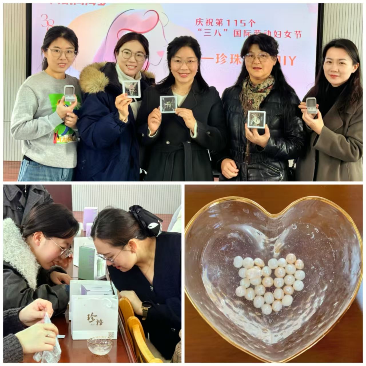 3月8日上午“珍珠手作之旅”率先拉开帷幕。活动现场,一颗颗孕育在蚌壳中的珍珠,在女教职工们的好奇与期待中被开启。每一颗珍珠的出现,都伴随着惊喜的呼声,大家纷纷感叹这是时光与运气馈赠的珍宝。在专业老师的指导下,女教职工们充分发挥创意,将这些珍珠精心制作成耳饰、胸针、戒指等精美饰品,不仅收获了独一无二的饰品,更留住了这份专属节日的浪漫,每一个专注的瞬间,都是对美的执着追求。